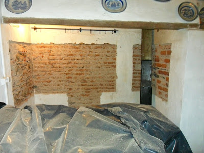 Depois foi agarrar nos martelos e nos escopros e partir todo o reboco, até chegar à ossatura da casa. O Manel e eu demorámos uma tarde inteira neste trabalho e no final, a cozinha dele parecia a Bósnia-Herzegovina em plena guerra, com poeira a esvoaçar, fragmentos de cal e areão por todo o lado. Embora nesta altura, o nosso Manel, que tem a mania das limpezas já estivesse à beira de um ataque de nervos, a jurar que ia enterrar os restantes azulejos, que comprou, não deixamos de observar com alguma surpresa os vários sistemas construtivos da casa.