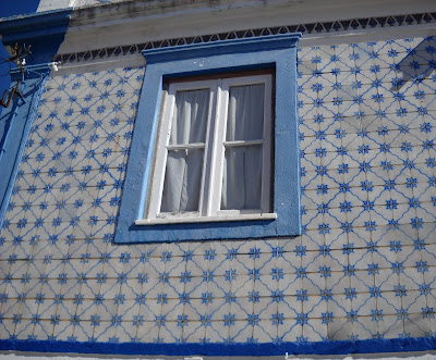 Fachada de casa revestida com azulejos bicha da praça. Fronteira