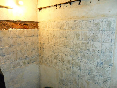 Primeiro houve que fazer medições, para definir a área onde havia que tirar o reboco. Como os azulejos não chegavam para revestir tudo e deixaram-se espaços vazios atrás dos dois fogões.