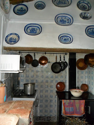 O cenário da cozinha catapultar-me para as cozinhas conventuais - embora a do Manel de menor dimensão é maior na grandeza do recheio: cataplana em cobre,barros,faiança em cima do fogão - bela bacia - o que dizer da coleção de inegável valor - predominante azul a forrar o chapéu da chaminé que se prolonga pela parede da cozinha... o fogão a lenha fez-me lembrar a minha infância - o meu seria mais apelativo pelos dourados em latão, os varões, torneira, aros). Gostei de ver o molho de lenha e da panela de alumínio ao fogão - o almoço(?). Gostei da bancada em lajes de cerâmica iguais ao que me parece do chão da sala que casaram muito bem com o lava loiças em mármore(?). Gostei dos pormenores: panos da loiça estendidos no varão do fogão, pote em barro com as colheres e talheres altos, caneco com a escovinha de lavar a loiça e do saleiro.