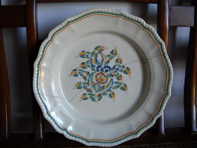 Quando chegamos a casa, o Manel correu para a banca da cozinha e pôs-se a raspar a massa nojenta do restauro. Descobriu que o prato tinha sido gateado, mas, num período qualquer da vida deste prato, uma criatura mal inspirada, tinha resolvido tirar os gatos e colar as partes com massa.