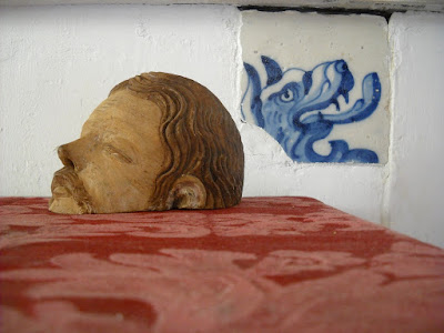 Como já aqui escrevi muitas vezes tenho sempre uma certa atracção por objectos estranhos ou bizarros, dos quais às vezes nem conheço a utilidade. Foi o caso desta peça, uma cabeça em madeira, cortada a metade, que estava na banca de um feirante de uma feira em Estremoz. Encantei-me logo com a qualidade escultórica do trabalho do cabelo e a expressão serena da figura. A peça também não estava repintada, como acontece com quase toda a arte sacra à venda naquela feira, em que as pintadelas modernas estragam irremediavelmente em dez minutos imagens, que sobreviveram ao tempo duzentos ou trezentos anos. Como o dono da banca, devia estar com dificuldade em vender uma meia cabeça, com um ar macabro, propôs-me um preço muito simpático e lá a levei eu todo contente. A peça estava colada a um prato de madeira, moderno, que me fez suspeitar que fosse um São João Baptista, mas como houve uns quantos santos cristãos decepados e esta meia cabeça, poderia ter feito parte de um qualquer grupo escultórico, representando, por exemplo os mártires de Marrocos.