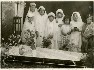Acho impressionante a foto das crianças à beira do caixão da menina morta. Mas parece que foi um hábito comum nessa época.Li em tempos um artigo, sobre a construção de cenários para esse tipo de fotografias, onde muitas vezes punham os mortos simulando uma actividade do seu dia-a-dia.Felizmente vão longe esses tempos.