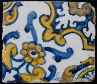 O segundo achado decorreu numa ruela qualquer que sai das escadinhas do Duque. Apesar de estar todo pintado de branco, vislumbrei-o logo. Estranhei ser de um tamanho muito pequeno e pensei que fosse talvez um azulejo do século XIX, daqueles que costumam ornamentar os prédios daquele bairro. Contudo era muito espesso para ser uma peça já industrial do século XIX. Cheguei a casa e raspei-o da tinta, que o cobria e descobri maravilhado um azulejo de padrão azul, verde e amarelo do século XVII.