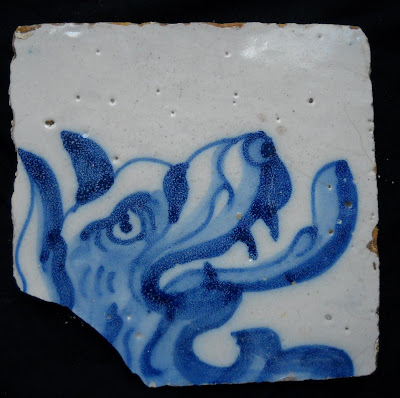 O Manel acha que quando isto voltar a acontecer, eu devia chama-lo para ele vir com a sua carrinha e transportarmos os sacos todos para vê-los um a um e retirar todos os azulejos. O pior é que moramos os dois em terceiros andares sem elevador. Em todo o caso é tentador tal é a estupidez das pessoas que fazem obras nestas casas da velha Lisboa, que deitam tudo fora. Muitos dos azulejos que aqui apanhei estão numerados no verso o que nos indica que terão feito parte de um painel. Os restos do friso com uma ramagem parecem-me da primeira metade do XVIII. No centro terá havido uma composição qualquer, da qual sobreviveu a cabeça deste cão com um ar feroz.
