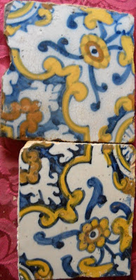 Pouco tempo depois, fui à Feira-da-ladra e descobri no chão um azulejo do século XVII, que me pareceu igualzinho ao meu. Compreio-o sem hesitar, apesar de não trazer o desenho da peça que tinha em casa. Quem quer completar um painel sabe que tem que andar com o desenho ou desenhos do azulejo na carteira para comprar igual, pois há muitas variantes do mesmo padrão e se confiamos na memória arriscamo-nos a comprar uma coisa qualquer, que é parecida, mas não é a mesma coisa. O meu amigo Manel tem uma folhinha desdobrável com todos os padrões de azulejos, que está coleccionar, desenhados e pintados com uma enorme perfeição, a uma escala muito reduzida. Mas, voltando ao assunto, arrisquei, comprei-o na mesma e tive sorte porque o azulejo era exactamente do mesmo padrão que eu já tinha em casa.
