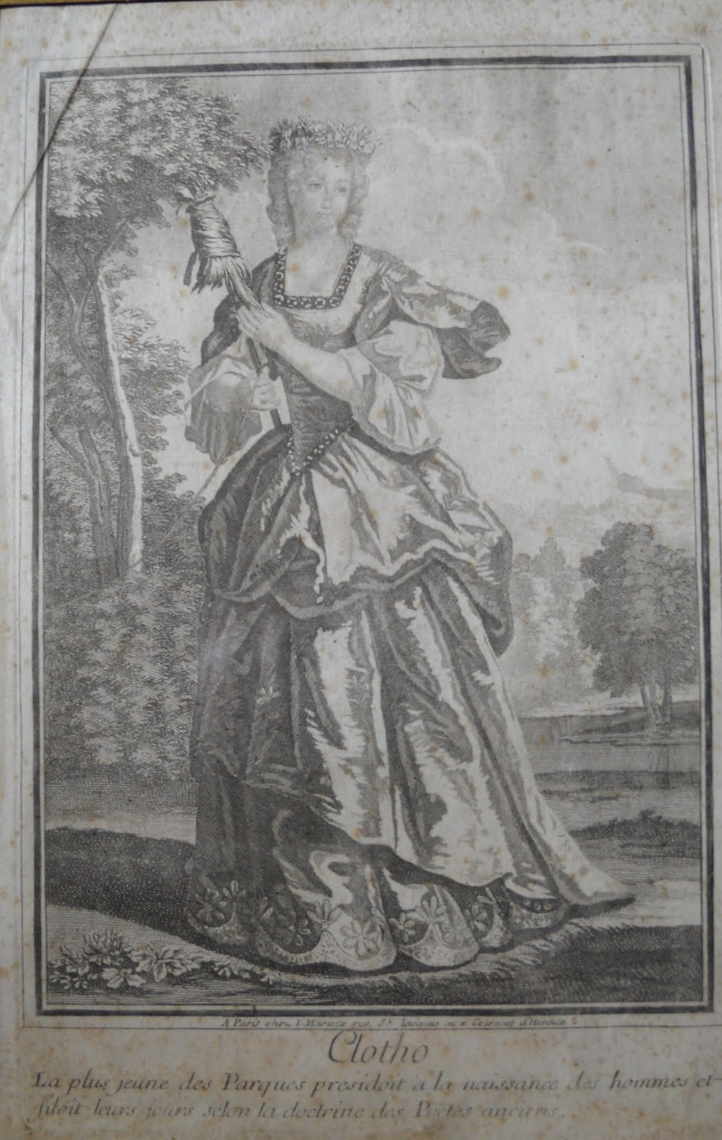 Apesar de estar aqui representada com um luxuoso vestido de seda, próprio para um baile na corte em Versalhes, esta Clotho é uma das parcas, figuras temíveis e muito pouco simpáticas da mitologia greco romana, que presidiam aos destinos dos Homens.