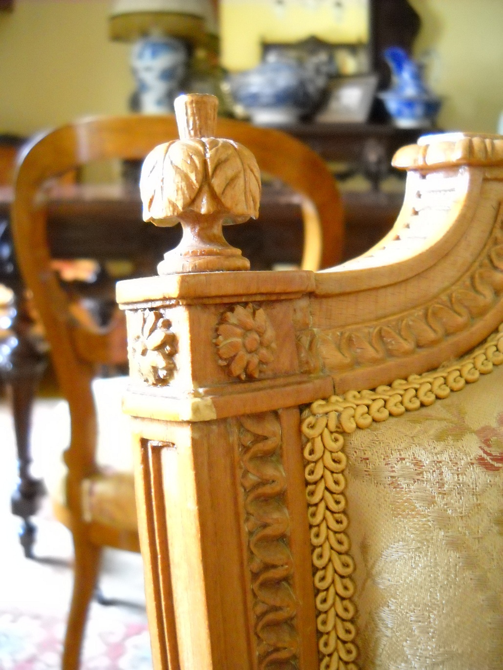 Na verdade esta cadeira é muito provavelmente da época de Napoleão III, acerca da qual já aqui escrevemos. A sua mulher, a espanhola, Eugénia de Montijo, tinha uma verdadeira paixão pelo mobiliário estilo Luís XVI, de que mandou executar inúmeras cópias, lançando assim uma moda, que se espalhou por toda a Europa e Américas. Em França chamam as estas cópias “Louis XVI-Impératrice” e a partir de meados do século XIX multiplicaram-se por todas as grandes casas burguesas de Lisboa a Varsóvia, passando por Berlim e estendendo-se ao Rio de Janeiro ou a Nova Iorque.