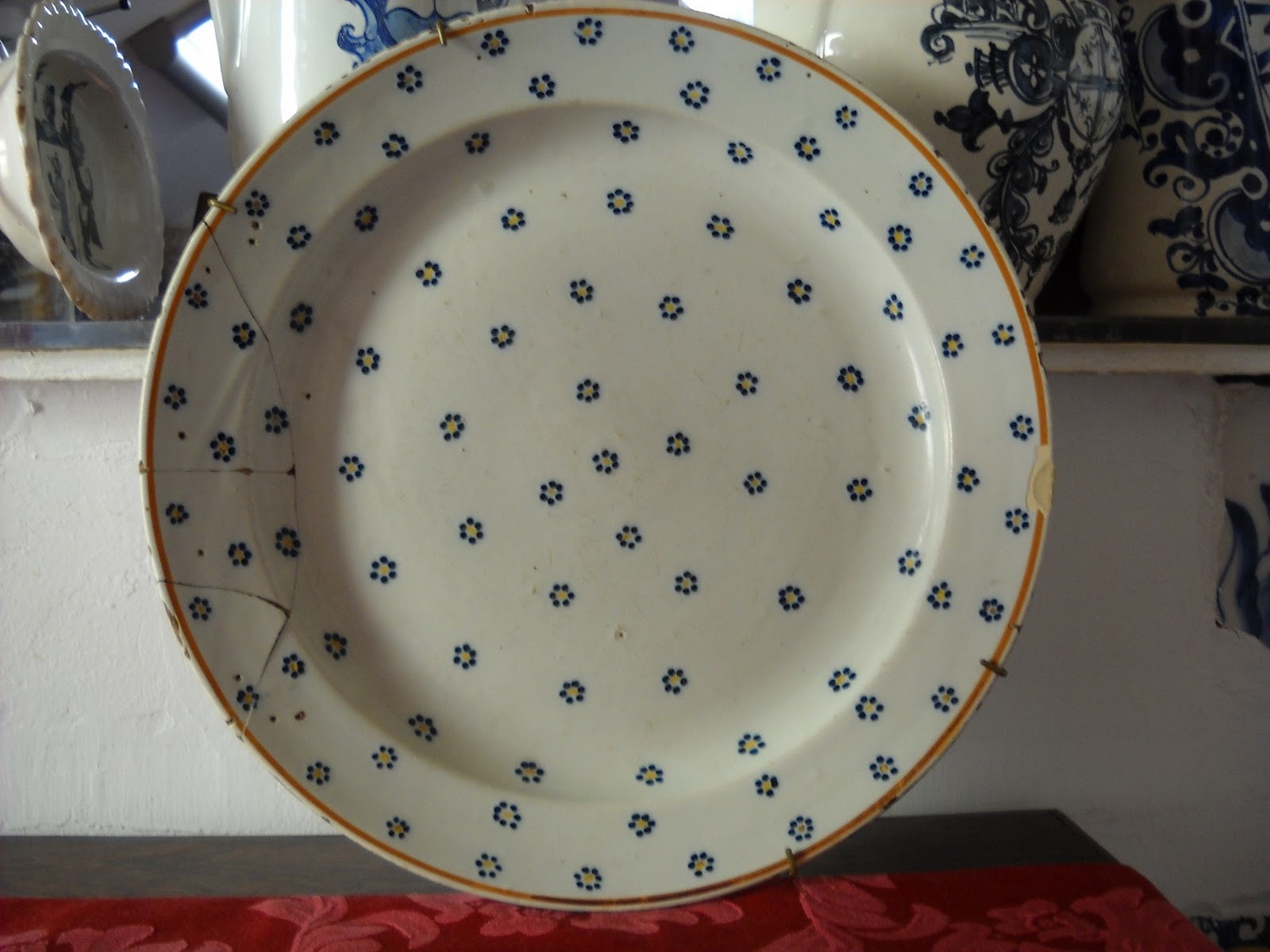 Já há muito tempo que apresentei este grande prato de faiança aqui no blog. Nesse post aventei a hipótese de se tratar de uma peça saída da Fábrica Rocha Soares em Miragaia. No catálogo da exposição Fábrica de Louça de Miragaia. Lisboa: IMC, 2008 são mostrados alguns fragmentos de faiança achados nas escavações realizadas no local onde era a antiga Fábrica de Miragaia, e entre eles encontrava-se um caco com umas florinhas iguais às do meu prato e foi isso que, me levou a achar que poderia ser uma manufactura de Miragaia. Esta crença era também reforçada pela origem do prato, que tinha sido trazido do Norte de Portugal.