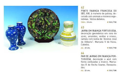 Há cerca de 15 dias, estava a desfolhar um catálogo da leiloeira Aqueduto (21 de Março de 2007), a imaginar tudo aquilo que compraria se tivesse uma casa maior e se fosse rico, quando vejo um par de jarras de altar, com uma decoração idêntica à minha, só que com o fundo em azul. Fui ler a legenda e lá estava a confirmação das minhas suspeitas: as jarras da fotografia estão marcadas com o característico R da Fábrica Rocha Soares de Miragaia. O R é a é obviamente a inicial do nome Rocha.