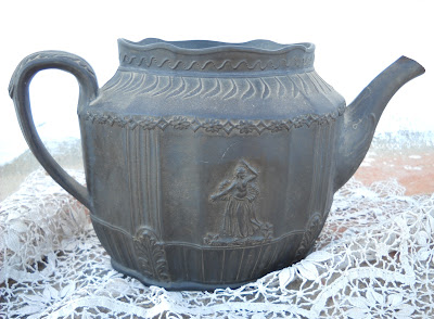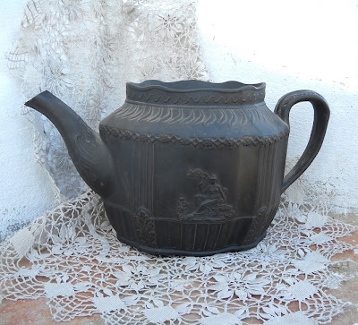 O Manel comprou recentemente este bule, que apesar de lhe faltar a tampa não deixa de ser uma peça neoclássica muito elegante. É certamente inglesa, talvez datada logo do início do século XIX e é inspirada na célebre loiça black basalt, produzida a partir de 1767 pela Wedgwood.
