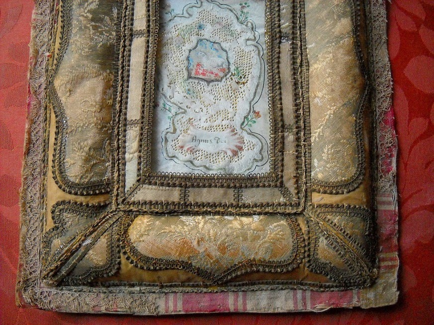 Quanto à moldura do registo, foi feita em cartão e o formato semicilíndrico foi-lhe dado cosendo as pontas, de modo enrola-lo e para ficar com a devida consistência foi enchido com papéis, talvez velhas cartas, todas manuscritas com uma letra que parece do século XVIII. Depois essa estrutura foi revestida com restinhos de tecidos em seda estampados, fixados com uma daquelas colas caseiras feitas com farinha e a disfarçar as junções colocaram um fio metálico, imitando uma renda, que em tempos foi prateado. Na orla foi colocada uma passamanaria, em renda de bilros, que coitada, está muito desfeita. Atrás existe um mero cartão sem qualquer espécie de ornato, pois era a parte que estava virada para a parede, que as pessoas não viam.