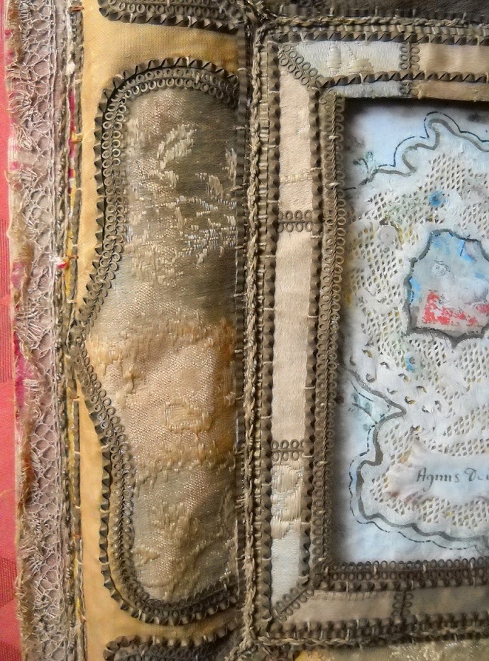 É um trabalho minucioso, um daqueles ditos lavores femininos, normalmente feitos em conventos, ou por senhoras ou meninas criadas nessas casas religiosas e que tinham todo o tempo do mundo para estes trabalhos feitos com restos de tecido, contas, missangas e passamanaria.