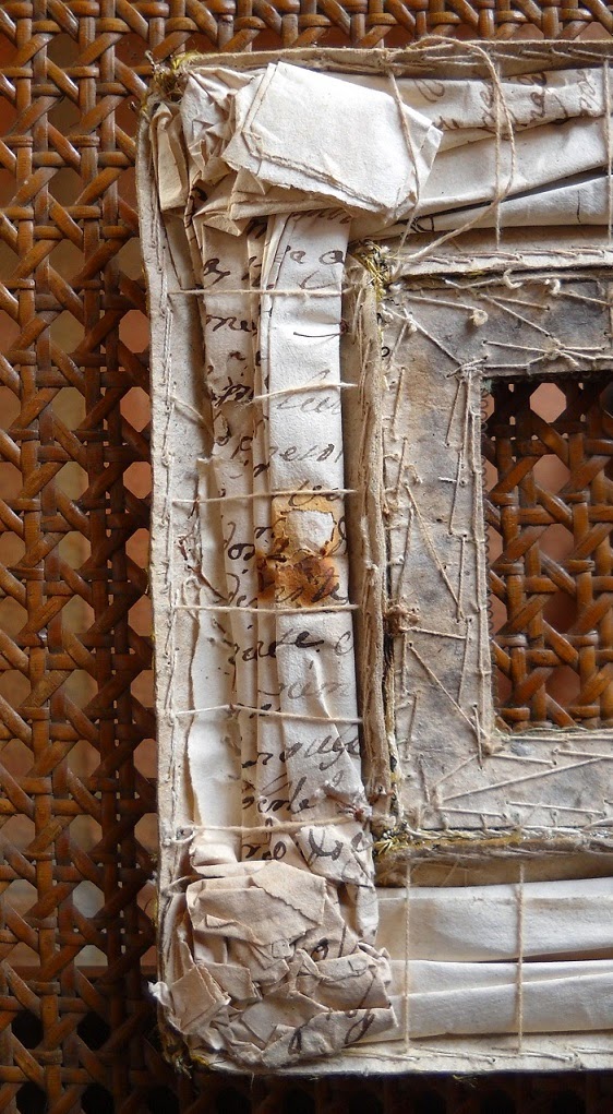 Nunca tinha visto nenhum registo visto com esta técnica, mas também é verdade que nunca desmanchei muitos. Já comprei dois ou três registos, de tal maneira estragados, que tive que deitar fora a moldura e aproveitar apenas a estampa. Nessas peças, o relevo da moldura era feito com quatro canas cortadas, que formavam um rectângulo. Em todo o caso, numa deles, para dar mais consistência ao cartão onde o registo assentava encontrei fragmentos de editais da Inquisição, que um um dia mostrarei aqui no blog.