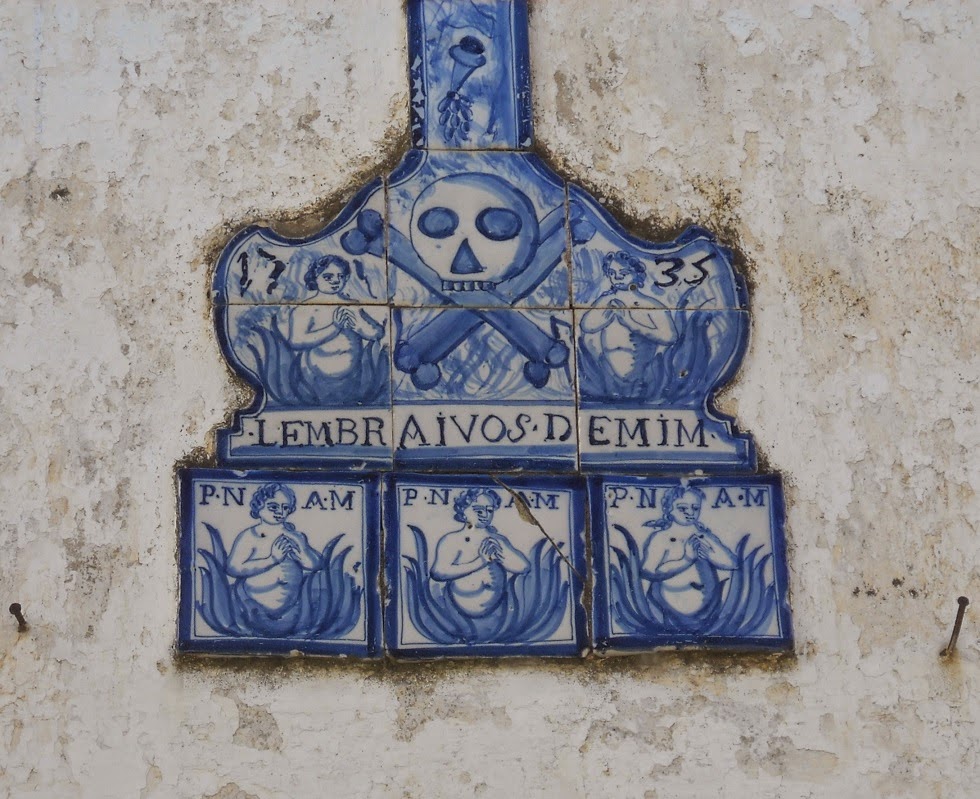 Acho a base da cruz muito interessante, a reproduzir uma peanha. Os azulejos com a figura de uma alminha a arder em chamas deviam ser fabricados “em série” mas depois há os outros com a representação da morte, fabricados como painel recortado e com uma inscrição. O painel parece estar datado de 1735, o que é muito raro encontrar-se, a tinta da mesma cor da legenda Curiosamente esta data não é referida por José Queirós no capítulo de azulejos datados, da obra “Cerâmica Portuguesa e Outros Estudos”.