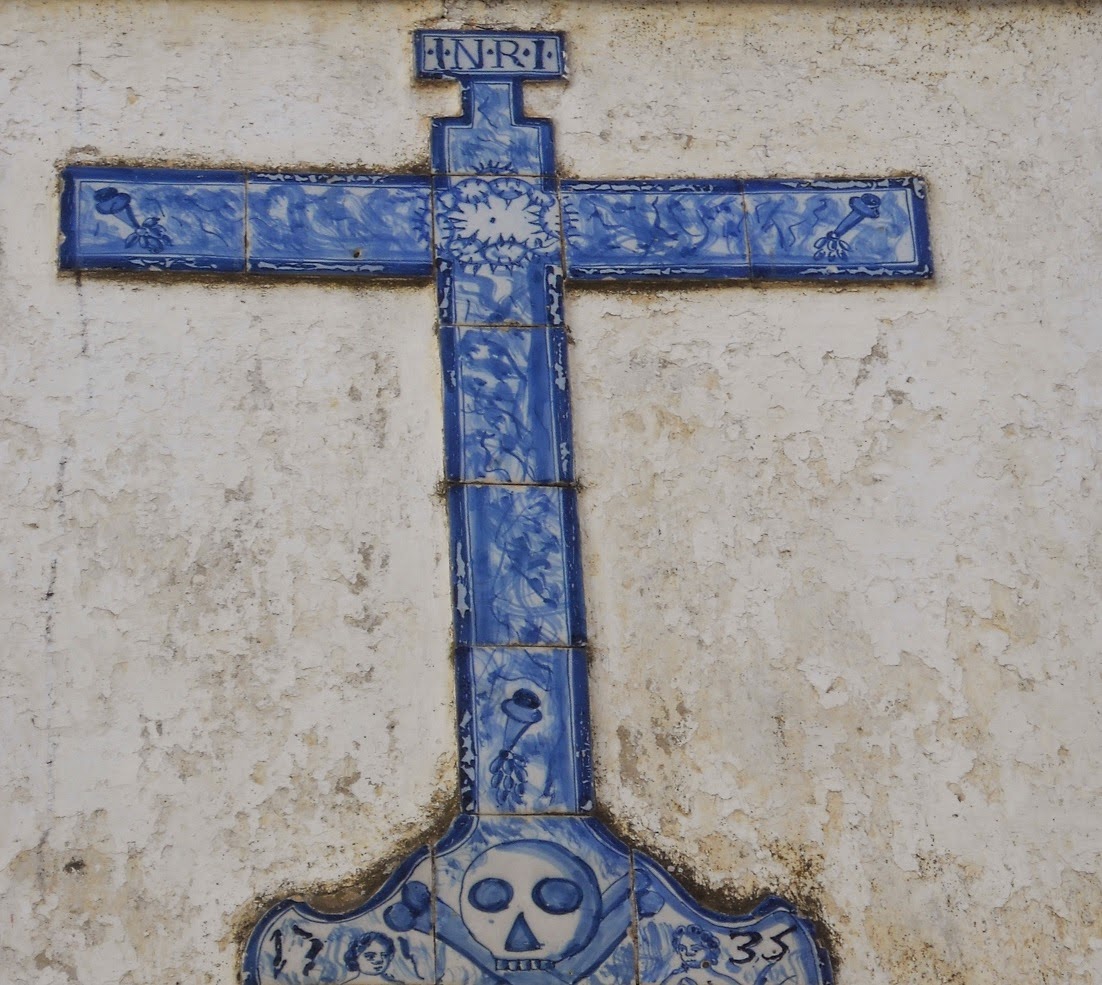 O Painel é de facto invulgar pela data, 1735. Julgo que não há muitos datados. O tipo de painel em forma de cruz com uma peanha é comum no Sul e já aqui mostrei vários desse género. O que talvez seja mais giro, foi esse facto que reparou, que se misturam azulejos de série, como as figurinhas de baixo, que se deviam vender soltas, com outros azulejos, especialmente concebidos para fazer um painel. É mais um caso da criatividade da azulejaria portuguesa.