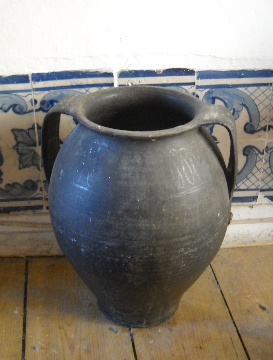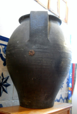 Há cerca de uns doze anos comprei este grande recipiente de barro preto, em Vinhais, num senhor que vendia velharias. Foi uma peça bem regateada, pois o vendedor, presumindo que eu era um finaço qualquer de Lisboa, queria-me fazer um preço alto. Comprei-o a pensar coloca-lo logo à entrada de casa, para pôr os guarda-chuvas. O que ainda hoje estou para perceber, foi como consegui encaixa-lo no carro que tinha na altura, um Fiat Cinquento, juntamente com dois filhos, um bonsai, fraldas, brinquedos e a bagagem para 15 dias de férias e ainda fazer 550 km de regresso até Lisboa com aquela tralha toda.