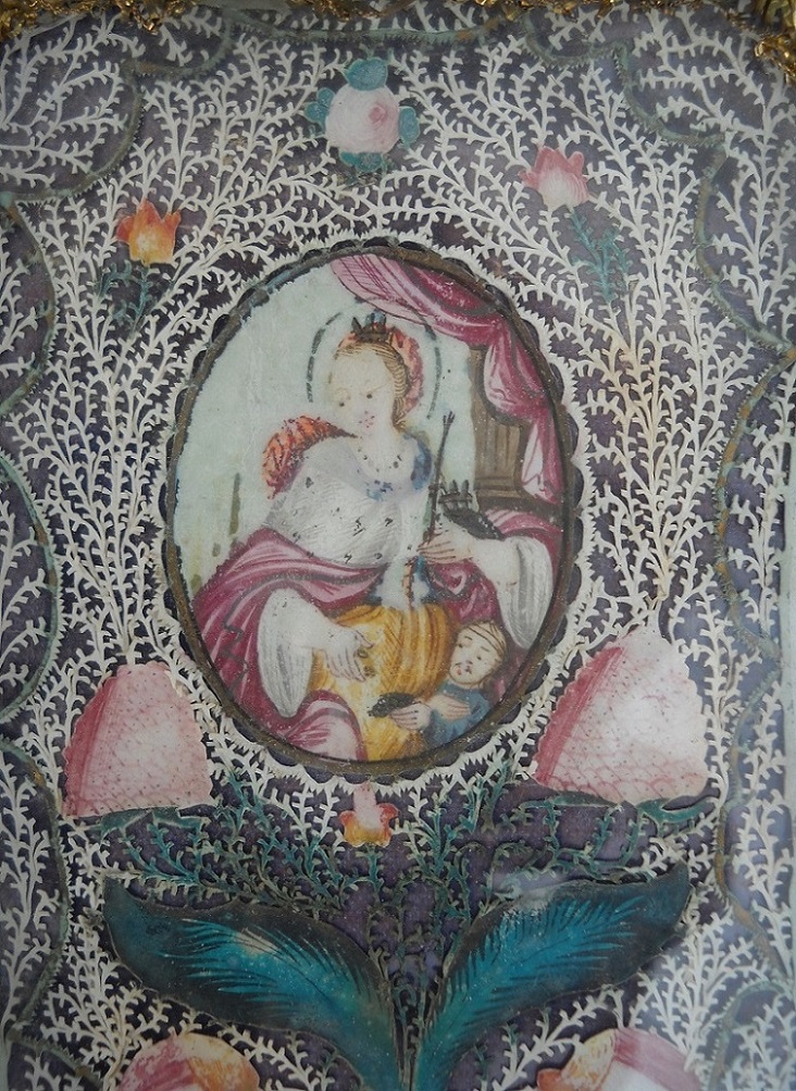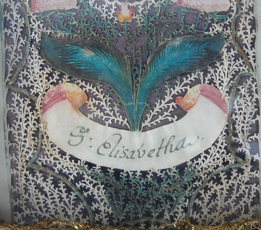 Se a Santa Isabel representada na imagem será a da Hungria, já o trabalho da moldura, uma estrutura montada sobre um cartão e revestida de seda, bordada a missangas de ouro e prata é mais caracteristicamente português, certamente um trabalho freirático.