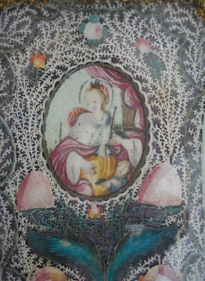 Como já aqui expliquei anteriormente, canivet, é um termo francês que quer dizer canivete e que alude ao instrumento de trabalho, com que eram feitas as imagens dos santinhos, um estilete pontiagudo e aguçado, com o qual se picotava um pedaço de papel, pergaminho, velino ou tecido, de modo a formar o efeito de uma renda. A imagem do santinho era desenhada e aguarelada. Estes trabalhos normalmente datam dos século XVII ou XVIII e eram feitos por monjas, que os vendiam para fora, como forma de garantirem proventos extraordinários para os seus conventos. Nunca estão assinados e as informações que se encontram na internet sobre os canivets atribuem estes trabalhos a conventos situados em França, em Itália ou no mundo germânico, designação que abarcará certamente os Países Baixos. No entanto estes canivets aparecem bastante cá em Portugal e não sei se foram importados de França da Alemanha, Flandres ou Itália ou se foram obra das mãos das nossas freiras, em cujos conventos existiu também uma tradição de trabalhos preciosos de papel recortado, que persistiu até há bem pouco tempo. O que é certo é que os exemplares que encontrei nas terras lusitanas tem sempre a legenda em latim e nunca em português, como era vulgar nas estampas devotas impressas por cá, nesse mesmo período.