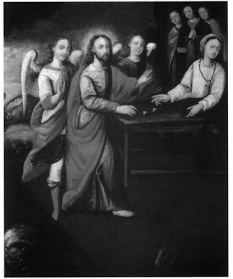 Resolvi continuar as minhas buscas através da iconografia e procurei santas que usassem coroas de rosas e o mesmo hábito, que enverga a figura do painel. Embora haja umas quantas santas que sejam representadas com coroas de rosas, por causa do hábito de dominicana, acabei por me convencer que é mais provável tratar-se de Santa Rosa de Lima (1586-1617), uma mística peruana, constantemente visitada pela Virgem Maria e pelo Menino Jesus. Até porque realmente encontrei uma tela do século XVIII, no Museu de Osma, em Lima, mostrando Rosa de Lima jogando dados com Jesus.