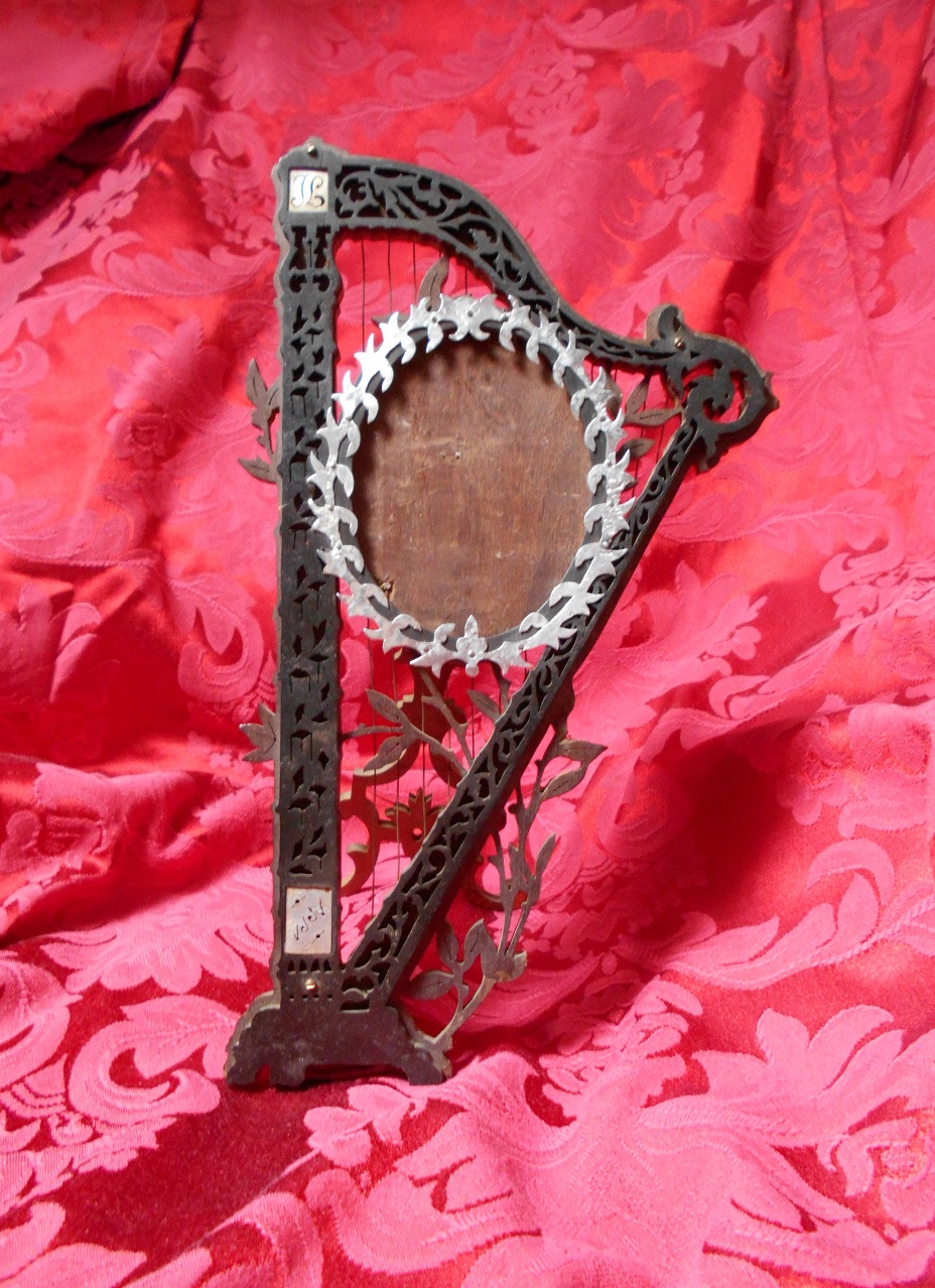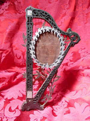 A mais recente aquisição foi este porta-retratos em forma de harpa, composto por duas placas diferentes de madeira artisticamente recortadas. É um objecto muito ao gosto da arte nova, que me encantou de imediato. Procurei obter algumas informações sobre esta peça no google e fiz umas quantas pesquisas por palavras chave naquele motor de busca , em francês, português e inglês e acabei por ir ter à pagina de um senhor espanhol, http://www.finescrollsaw.com, que ainda executa estes trabalhos a partir de moldes antigos e cuja leitura me permitiu perceber exactamente o objecto que tinha em não.