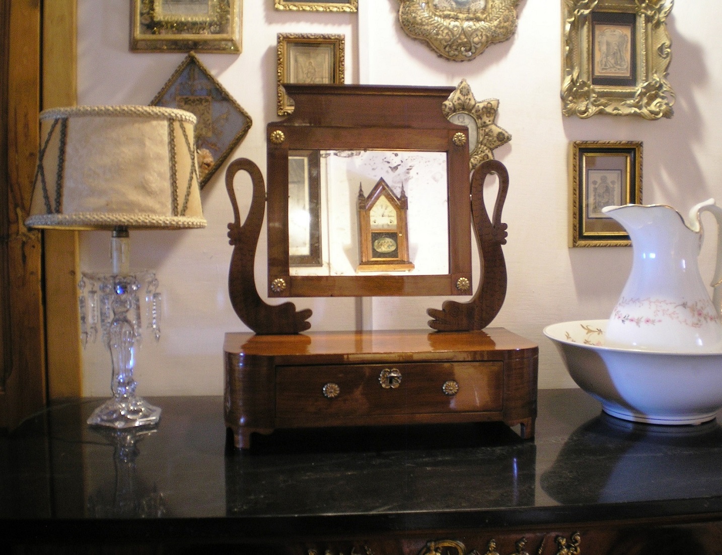 É constituído por um espelho basculante, apoiado em duas traves com uma representação convencional de dois golfinhos e assenta uma caixa com uma gaveta. É folheado a nogueira e lacado à boneca. Foi uma peça destinada a estar pousada numa cómoda ou numa pequena mesa, com tampo de mármore, e em tempos serviu para uma qualquer jovem ou senhora arranjar os seus cabelos e na gavetinha guardaria uma escova, um pente, um ou outro unguento, fitas coloridas e uns ganchos.