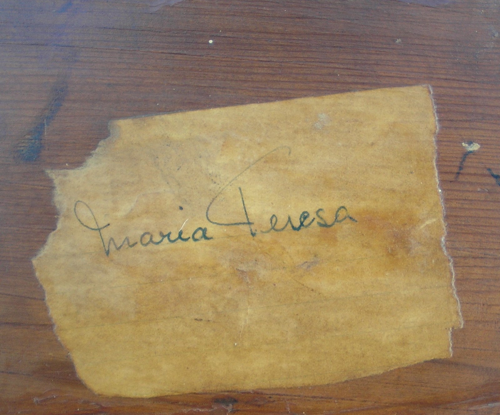 No verso, este toucador tem um papel, onde alguém escreveu Maria Teresa. É uma letra feminina, comum às senhoras que fizeram a sua instrução nos anos 20 e 30 do século XX. A minha mãe, que por acaso também era Teresa, tinha exactamente este tipo de letra e enfim, todos nós sabemos que a cada época, corresponde uma caligrafia. Provavelmente, durante umas partilhas familiares, alguém colou este papel no móvel destinando-o à Maria Teresa. Entretanto, passaram mais algumas décadas, a Maria Teresa morreu e os descendentes não quiseram saber mais deste móvel, tornado inútil pela casa de banho. Mas, talvez mais do que a casa de banho, o que condenou à extinção definitiva estes toucadores, bem como os seus parentes próximos, os psichés, foi a pressa da nossa sociedade contemporânea. Hoje as mulheres trabalham todas e acabam de se arranhar nos transportes públicos ou mesmo no carro. Quantas vezes, já não vi eu, logo de manhã, no carro, as mulheres aplicarem base, usando o espelho por cima do volante, no momento em que o sinal está vermelho.