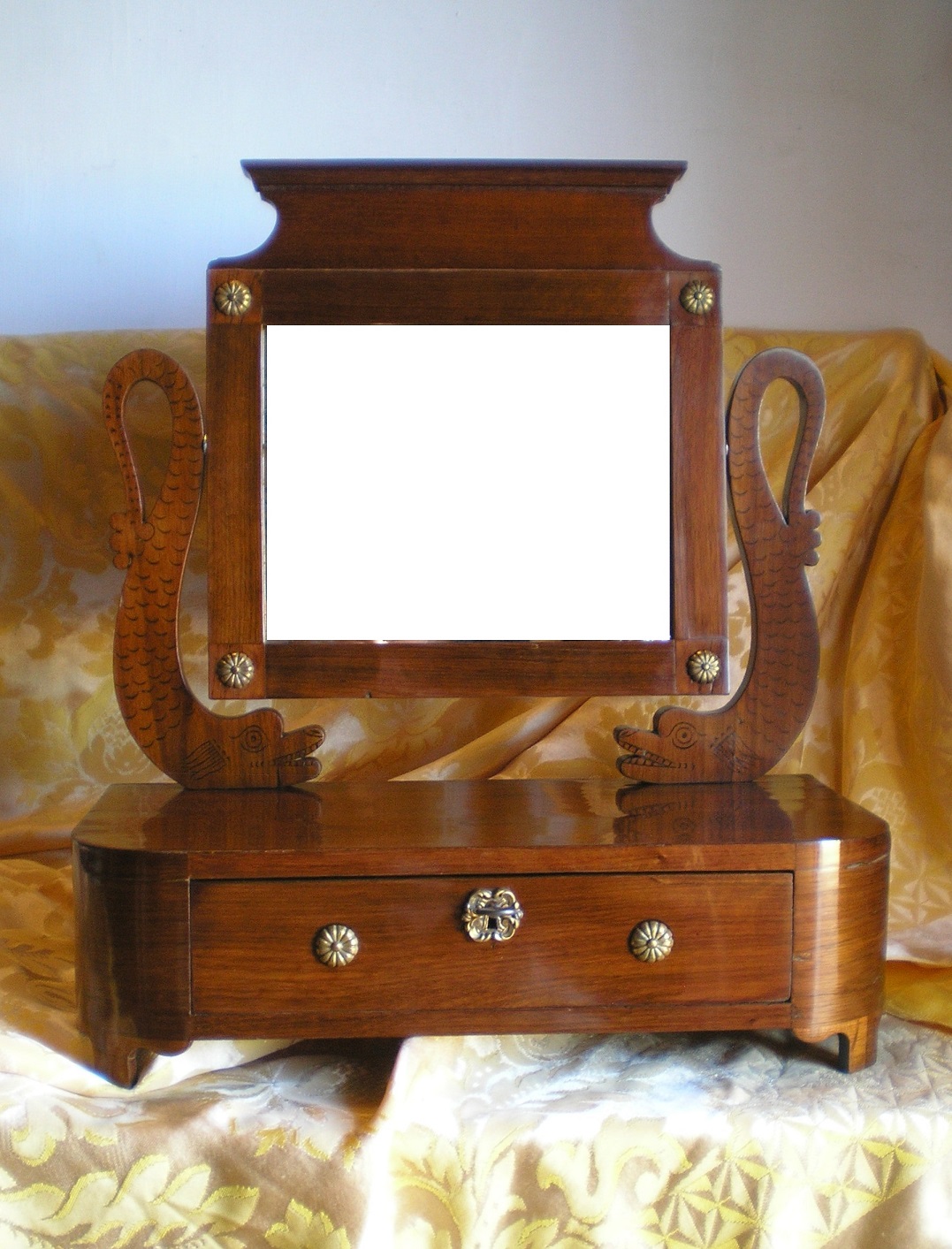 Muito bonito o móvel, uma pena que tenha caído de moda, mas ele já teve os seus dias de grande utilidade nos quartos de mocinhas e das senhoras. Adorei os golfinhos ladeando o espelho. O móvel fica bem como decoração nos medonhos dias de hoje quando tudo é corrido e que, às vezes, nem se olha a própria cara. E ainda é útil.