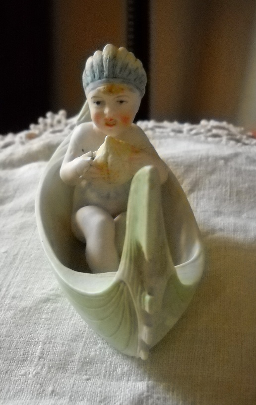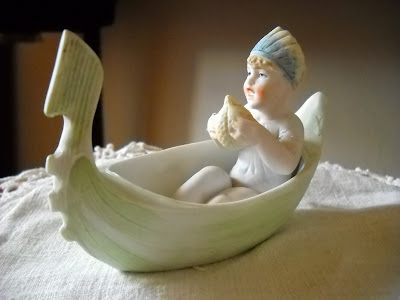 Quando olho para esta menina navegando na sua Gondola fantasiosa, só me recordo de um show de travesti que vi há muito anos, em que um calmeirão vestido com um fato de banho de menina ao estilo dos anos 20 e enfiado numa bóia em forma de barco, cantava o velho êxito de Celly Campello, A lenda da conchinha. Talvez seja por causa desta recordação, que não resisti a comprar esta figurinha em biscuit. Por vezes, o nosso coleccionismo é guiado por estranhos impulsos.