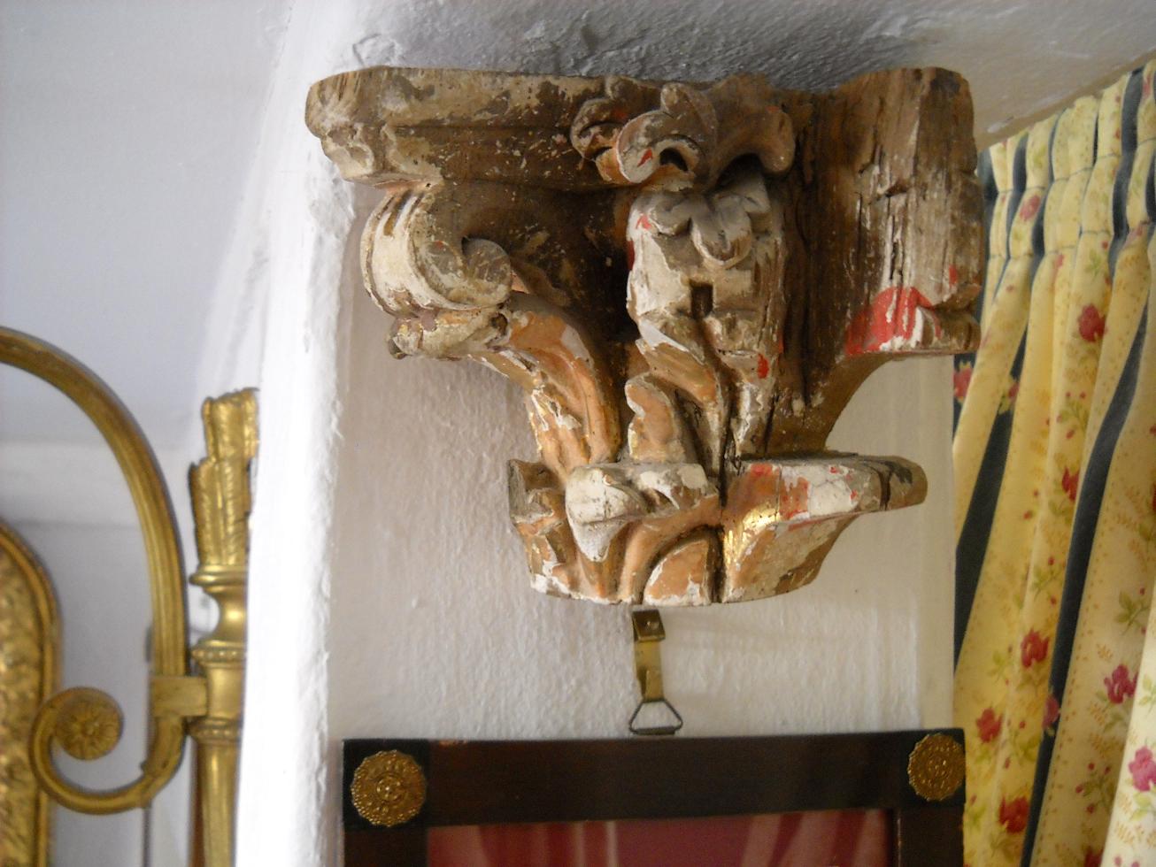 Certo dia na Feira-da-ladra comprei em conjunto uma cafeteira de porcelana e este fragmento de talha dourada. A cafeteira, que mais tarde descobri que poderia ser de fabrico russo encontrou logo um lugar no louceiro lá de casa, mas o pequeno capitel andou perdido no meu apartamento minúsculo, uns bons dois anos sem encontrar nenhum sítio onde pudesse brilhar com os seus doirados. O pobre capitel estava também muito mutilado atrás e num dos lados e tinha que ser exposto de um modo tal, que tapasse um pouco as marcas do tempo, esse grande escultor, como diria a Crayencour, mais conhecida pelo anagrama Yourcenar.